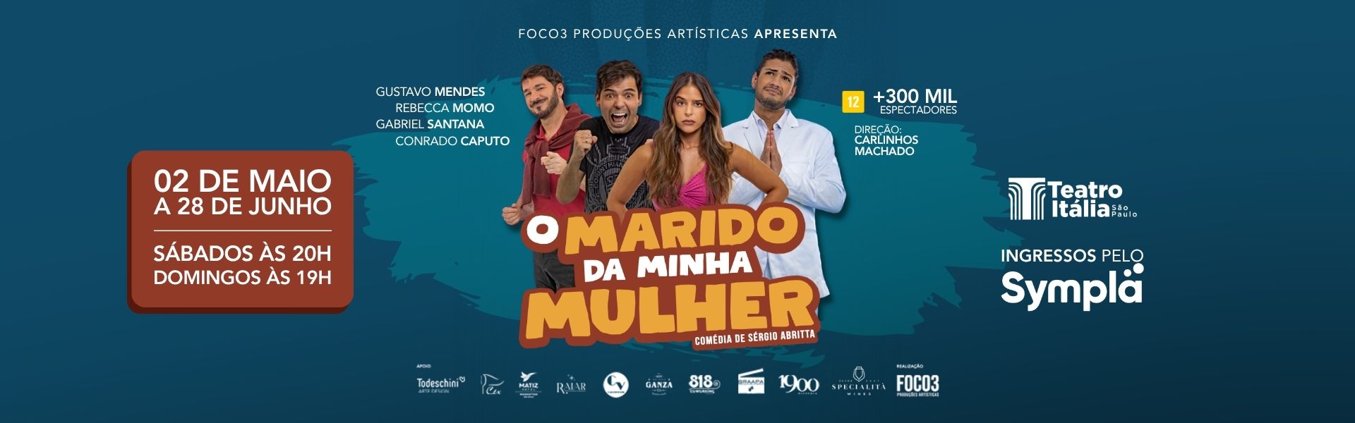 Uma das comédias de maior sucesso está de volta! “O Marido da Minha Mulher” conta a história de Alex (Gabriel Santana) um fanfarrão convicto e incorrigível, casado com Bruna (Rebecca Momo), uma dona de casa bonita e inteligente, que vive solitária. Numa de suas farras, Alex acaba sofrendo um acidente deixando viúva a bela esposa. Após a morte dele, a jovem viúva será disputada por Nico (Conrado Caputo), um mauricinho convicto, e por Paulo (Gustavo Mendes), melhor amigo de Alex. Para impedir que ela se case com seu desafeto, o morto volta à Terra e pede ajuda a seu melhor amigo. Assim se desenrola uma trama de confusões hilariantes, cheia de surpresas