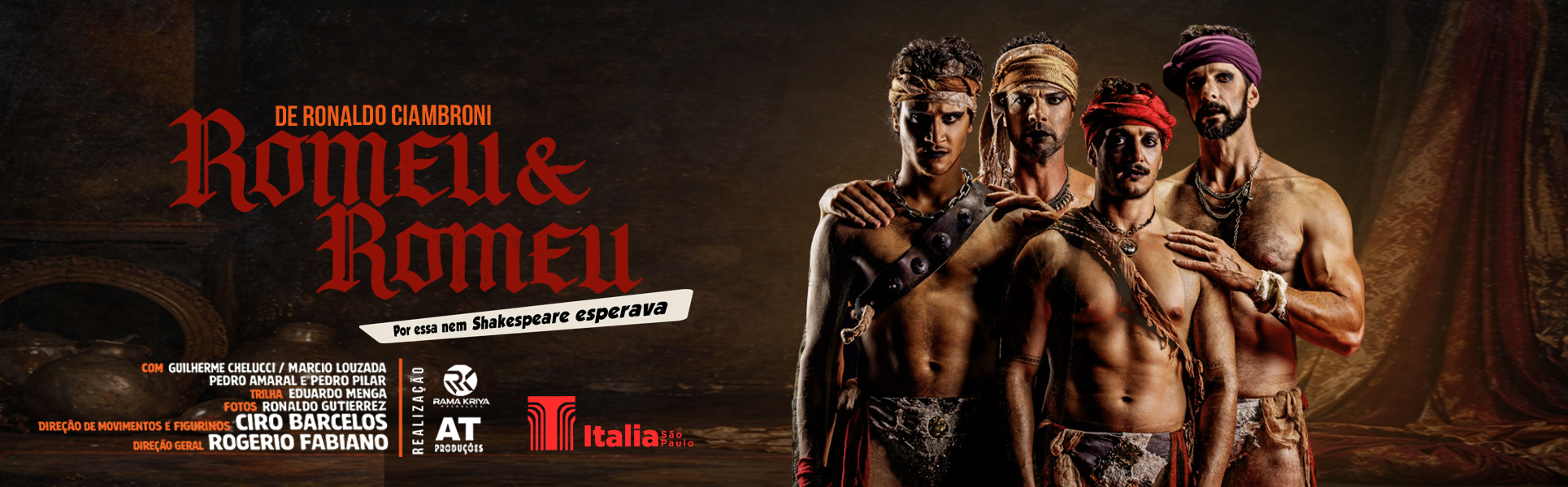 “Romeu e Romeu” destaca no palco a versão LGBTQIA+ do clássico texto de Shakespeare A Rama Kriya Produções anuncia para o primeiro semestre de 2026, a montagem do espetáculo “Romeu e Romeu - Por Essa nem Shakespeare Esperava”, com texto de Ronaldo Ciambroni, direção de Rogério Fabiano, direção de movimentos de Ciro Barcelos e produção de Lucienne Cunha. Com estreia anunciada para segunda quinzena de abril, no Teatro Itália, em São Paulo, a peça será conta com xperiência dos atores Guilherme Chelucci, Márcio Louzada, Pedro Amaral e Pedro Pilar, para retratar os desafios que um casal gay enfrenta para permanecer juntos. Segundo o diretor da montagem, Rogério Fabiano, “Romeu e Romeu” é um texto de grande sucesso devido ao seu forte e comovente foco na identificação do público com os personagens. “Trata-se de um amor proibido recheado de emoção e humor. Minha concepção trás a realidade da cena para uma luta, com um visual bem moderno e de grande impacto visual. Uma cena vibrante e muito movimentada, sem deixar o que temos, ali, de mais forte: o amor”, explica o diretor. “O texto escrito originalmente na década de 1980, certamente, envolverá para o público em geral ao afastar qualquer tipo de preconceito. Vamos apresentar uma montagem do espetáculo mostrando um recorte contemporâneo, mas o amor estará acima de tudo e de todos”, diz a produtora Lucienne Cunha. “ O espetáculo Romeu e Romeu promete um acalento gostoso na alma de quem acredita nas relação à longo prazo. Em tempos de “relações líquidas” nos deparamos nessa história com um casal em uma relação bem estabelecida, driblando com humor questões que, em outros tempos, tornariam essa relação impossível”, comemora Ciro Barcelos. A história inspirada no clássico “Romeu e Julieta”, de William Shakespeare, mantém o amor como temática principal. “Romeu e Romeu”, destaca no palco com leveza e com bastante humor, as dificuldades do cotidiano de um casal, os ciúmes, os dilemas domésticos e, certamente, o preconceito. A proposta é que o público reviva essa história tão conhecida e mostrar que tudo poderia ser alterado, com um final diferente onde o preconceito não venceria o amor é só uma atitude verdadeira poderia trazer a tão esperada felicidade. Na versão de Ciambroni, o personagem Romeu Camari faz faculdade de Medicina e pertence a uma família rica que vive em constante conflito com outra família: Os Mariane. As duas famílias dominam e disputam o comércio do principal bairro da cidade. A peça se desenrola entre tapas e beijos, drama e comédia, traição e amizade e uma dose de veneno com validade pro efeito acabar. Os dois rapazes se conhecem numa aposta de corrida de automóvel onde, num acidente, um primo dos Camari morre e aumenta o ódio das duas famílias, tornando assim, impossível o romance desses dois jovens sonhadores. Numa sequência de cenas emocionantes e que fazem parte dos romances que conhecemos, a história vai se desenvolvendo e surpreendendo e com certeza agradando a todos.