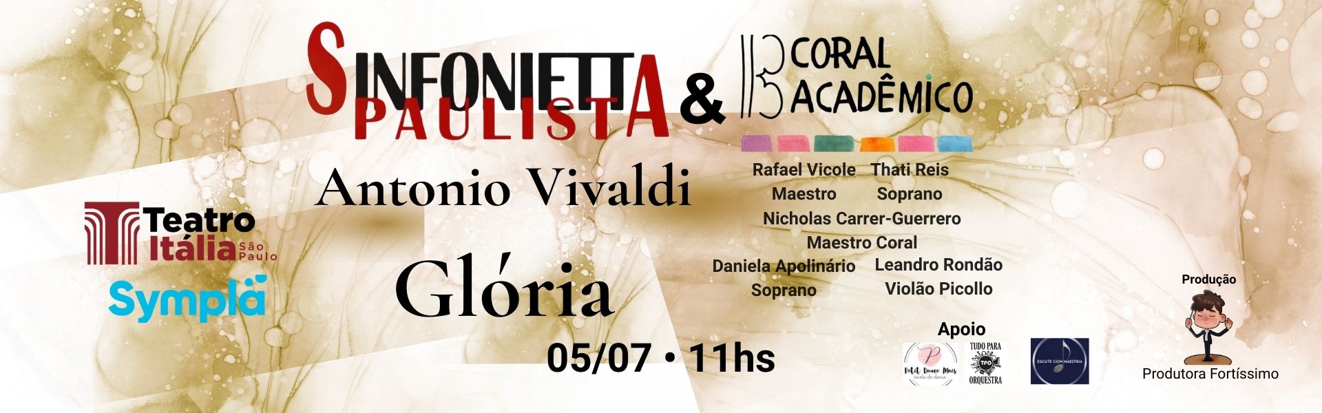 A Sinfonietta Paulista apresenta um mergulho profundo na genialidade de Antonio Vivaldi, um dos pilares do Barroco italiano. O programa percorre desde a intimidade virtuosística do violão até a opulência vocal do célebre Gloria, reunindo solistas de renome e o Coral Acadêmico sob a regência de seu Diretor Artístico. Destaques do Programa A noite inicia com a energia contagiante do Concerto alla Rustica em Sol Maior, uma obra breve, mas repleta de vigor rítmico, que prepara o público para a elegância do Concerto em Sol Menor. O primeiro grande destaque instrumental traz o solista Leandro Rondão para a execução do Concerto RV 93. Originalmente escrito para alaúde, a obra ganha uma sonoridade única e cristalina nas mãos de Rondão, que utilizará o violão piccolo — um instrumento de tessitura mais aguda que o tradicional, proporcionando o brilho e a agilidade exigidos pela escrita vivaldiana. O Ápice: Gloria em Ré Maior Para encerrar o concerto, a orquestra une-se ao Coral Acadêmico e às sopranos Thati Reis e Daniela Apolinário para a execução do monumental Gloria (RV 589). Redescoberta no século XX, esta peça tornou-se uma das obras sacras mais amadas do mundo. Com passagens que variam da exultação festiva à introspecção profunda, as vozes de Reis e Apolinário elevam a experiência a um patamar de pura transcendência. "Vivaldi não era apenas um mestre do ritmo, mas um arquiteto do som. Trazer o violão piccolo para o centro do palco e encerrar com a força do Gloria é oferecer ao público a síntese perfeita de sua obra: o humano e o divino," afirma a direção da Sinfonietta.